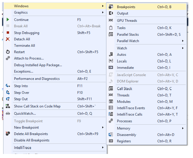 BreakPoints opens the BreakPoint Window and integrates it with other windows at the bottom of the Visual Studio environment. This window contains information about all BreakPoints currently set.