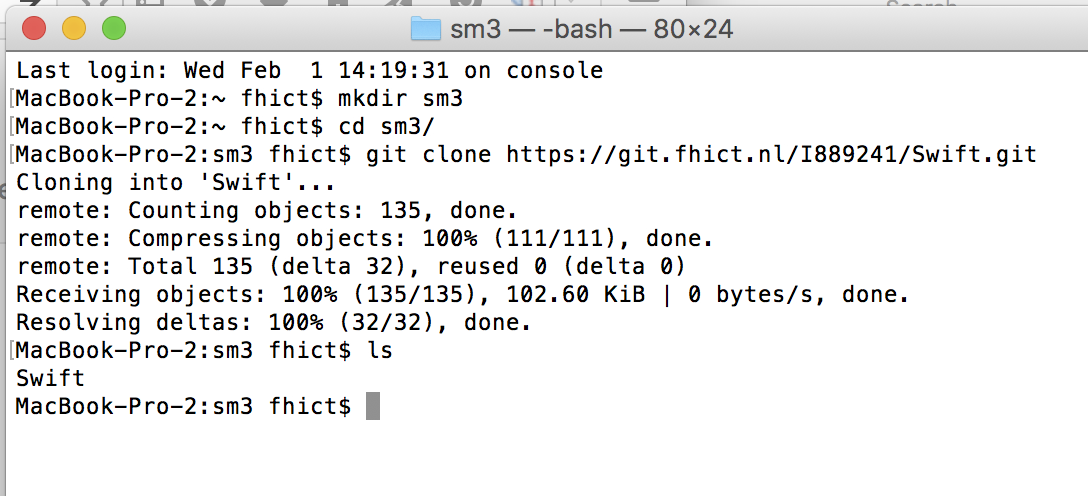 cd is short for Change Dir. Most of the time you don’t have to type whole names like Documents: just type Doc and press the tab key and probably the shell will complete the name. In the terminal clone the git-repository from the server to your local directory by typing: